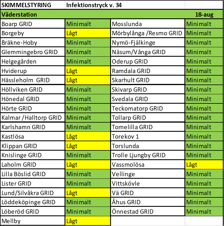 Det torra och varma vädret gör att bladmögeltrycket just nu är extremt lågt. Enligt Skimmelstyring är det inte motiverat att behandla på stationer med noll risk för bladmögel. Det går därför utmärkt att dra ut på intervallet och invänta ”bladmögelväder”. Om hög risk för alternaria bör dock intervallet mellan dessa behandlingar ske med max. 14 dagars intervall.