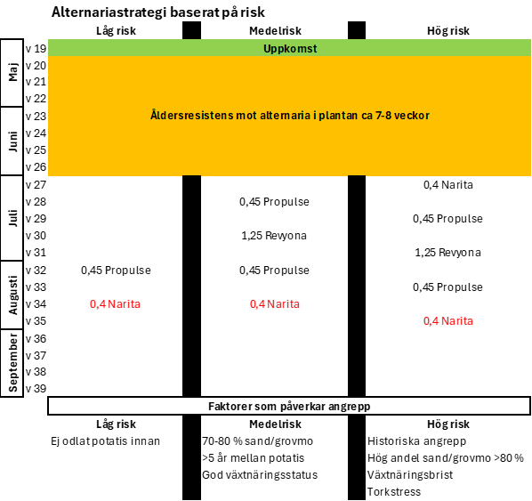 Vi har uppdaterat och justerat alternariastrategin enligt nedan. Förändringen gäller den sista behandlingen i samtliga strategier. Revyona är utbytt mot Narita eftersom den i vårt alternariaförsök visat på bättre effekt. Minst alternaria hittas i leden som fått extra växtnäring (kalium och kväve).