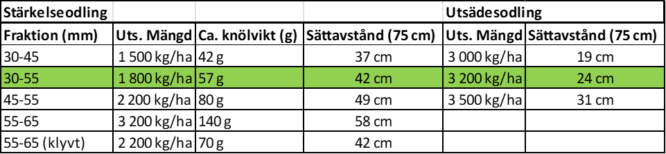 I stärkelseodlingen rekommenderas 1800 kg/ha för fraktionen 30-55 mm. Enligt våra försök går det att reducera utsädesmängden till 1500 kg/ha med bibehållen skörd.