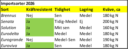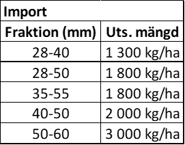 En del importsorter levereras i andra fraktioner. Framför allt 35-55 mm, 28-50 mm, 50-60 mm. Tabellen nedan visar utsädesmängden baserad på fraktion.